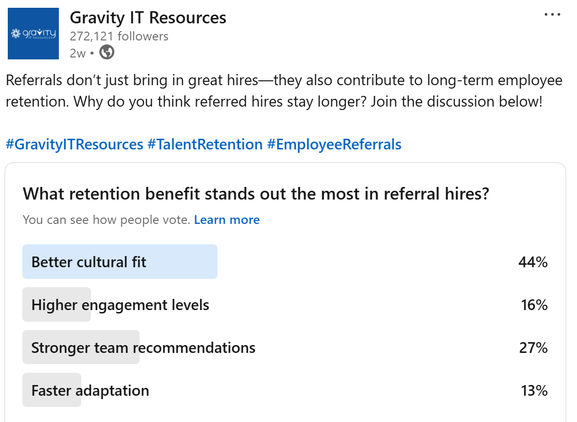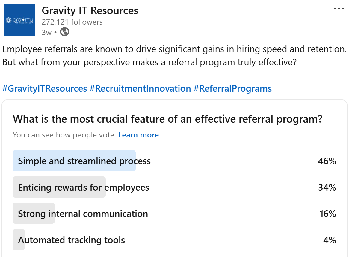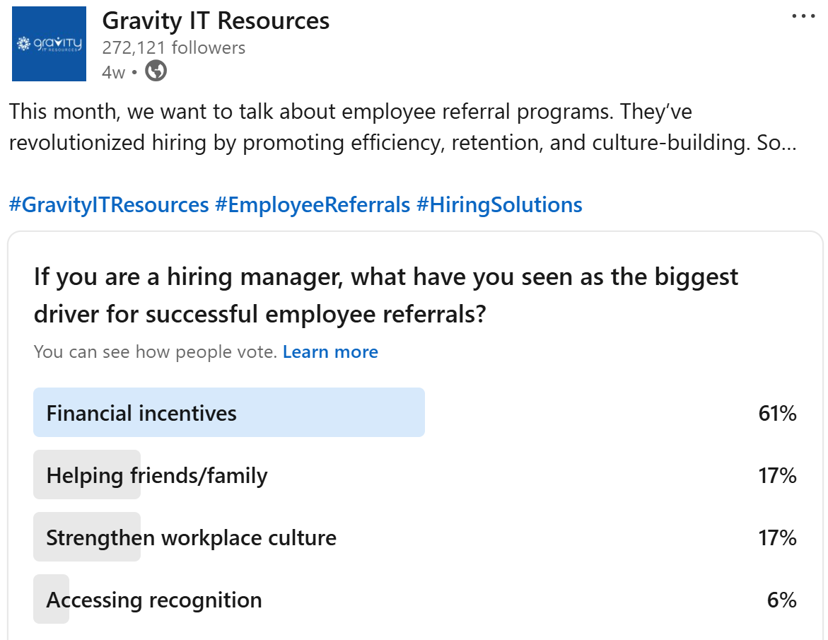 Our first poll asked a direct question to hiring managers regarding the biggest driver for successful referrals. With thousands of impressions, the consensus was clear.
