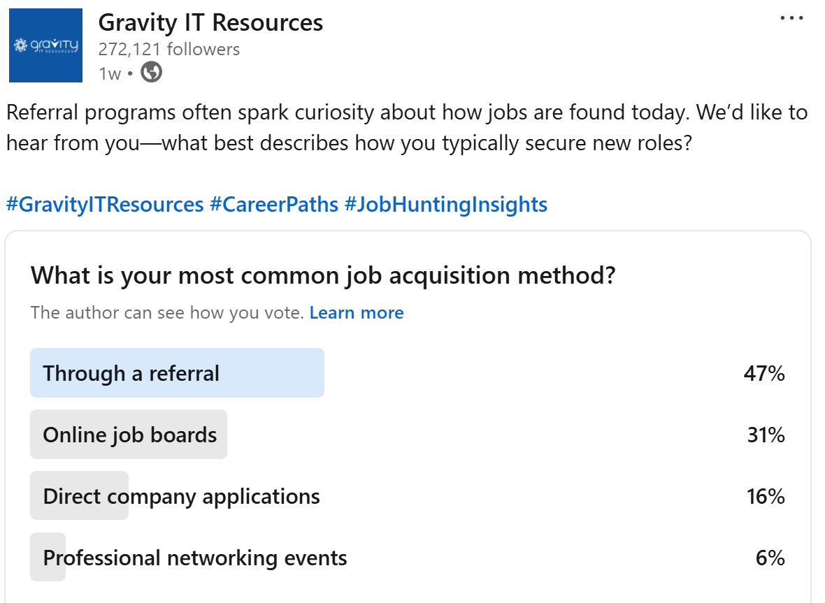 Finally, we wanted to validate these sentiments against the reality of the job market. We asked our audience how they typically secure new roles. The poll received our highest engagement of the month.